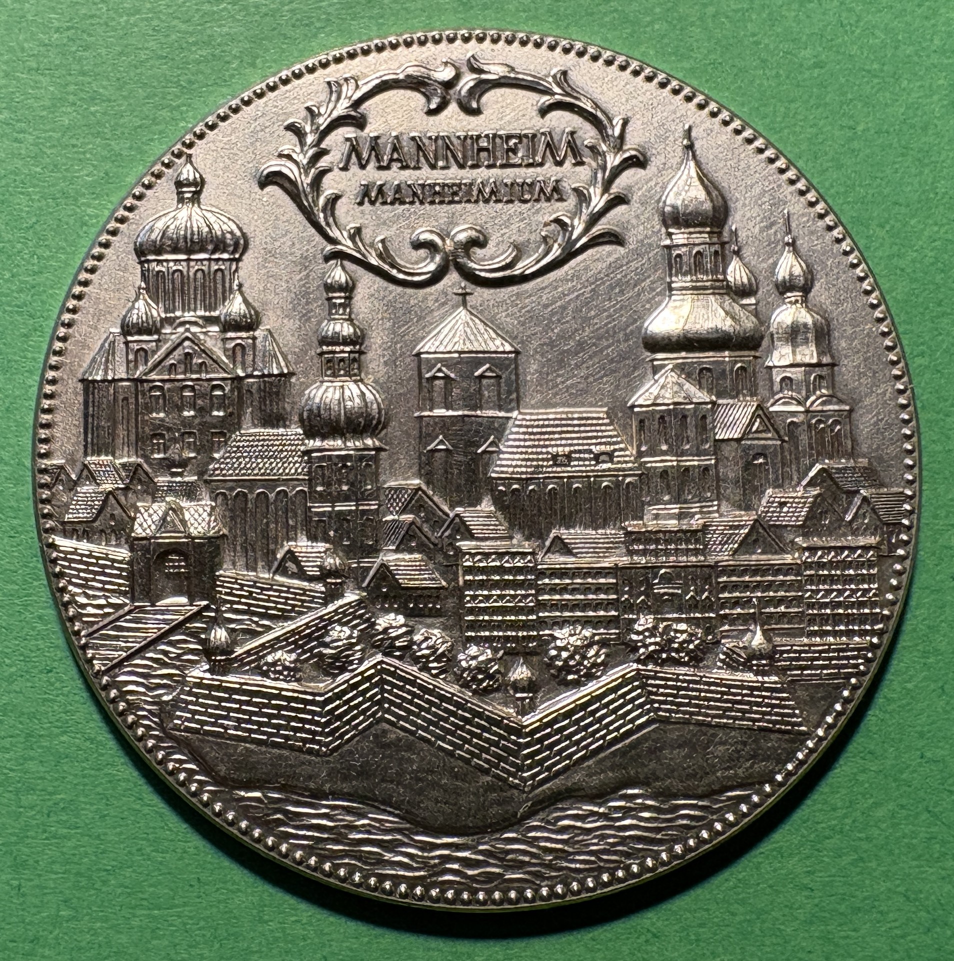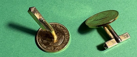 Silbermünze „Mannheim Manheimium“ – Ein paar gebrauhte, nicht komplett geputzte, goldfarbene Manschettenknöpfte mit je einem „Farthing“ aus 1942 und 1984 als Außenseite.