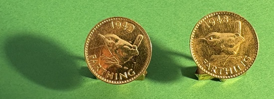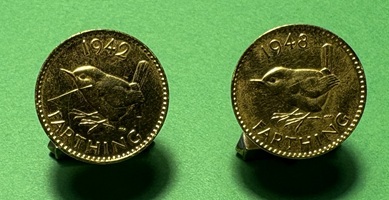 Ein paar gebrauhte, nicht komplett geputzte, goldfarbene Manschettenknöpfte mit je einem „Farthing“ aus 1942 und 1948 als Außenseite.